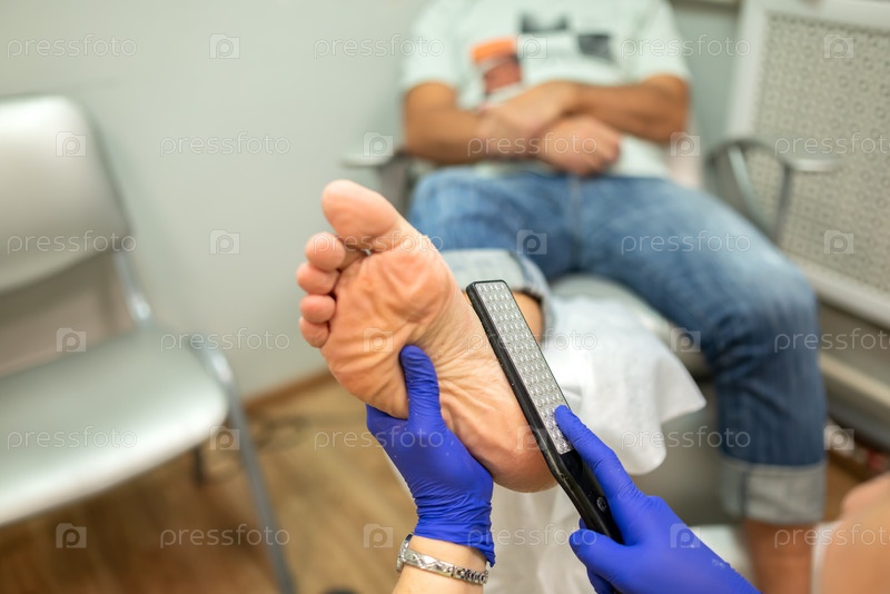 Концепция мужского педикюра, педикюра ног, косметолог делает классический педикюр для пожилого клиента-мужчины