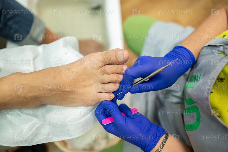Концепция мужского педикюра, педикюра ног, косметолог делает классический педикюр для пожилого клиента-мужчины