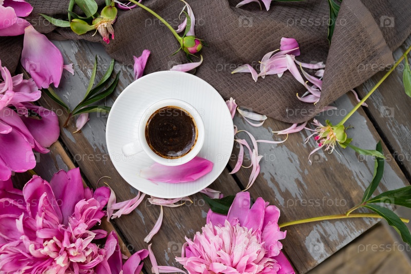 Розовые цветы пиона и чашка кофе на белом фоне. Утро, весна, модная композиция. Плоская планировка, вид сверху, пространство для копирования