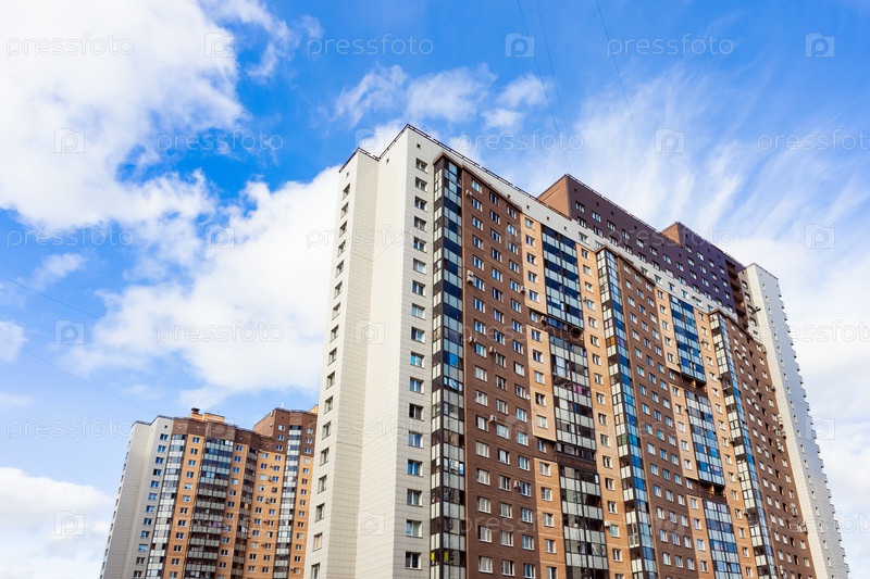 Многоэтажное здание на фоне голубого неба и белых облаков