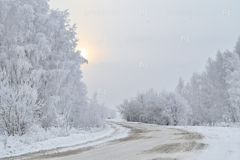 Заснеженная дорога в зимнем лесу