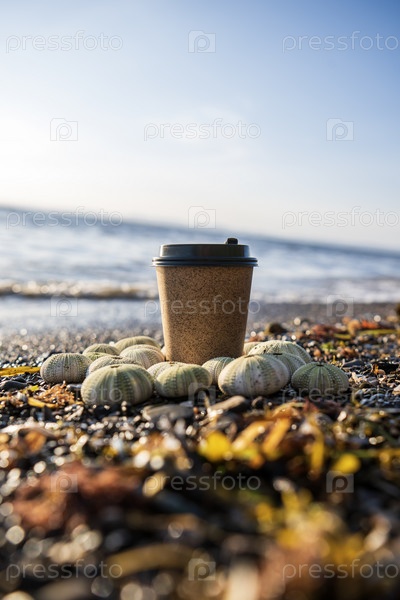 Чашка кофе навынос с морскими ежами на пляже