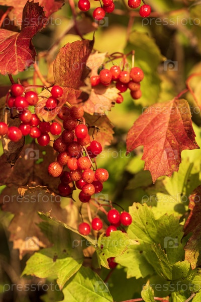 Красные ягоды калины на ветке в осеннем лесу