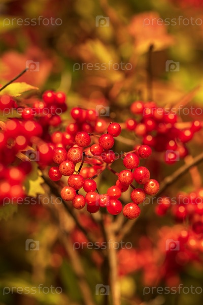 Красные ягоды калины на ветке в осеннем лесу