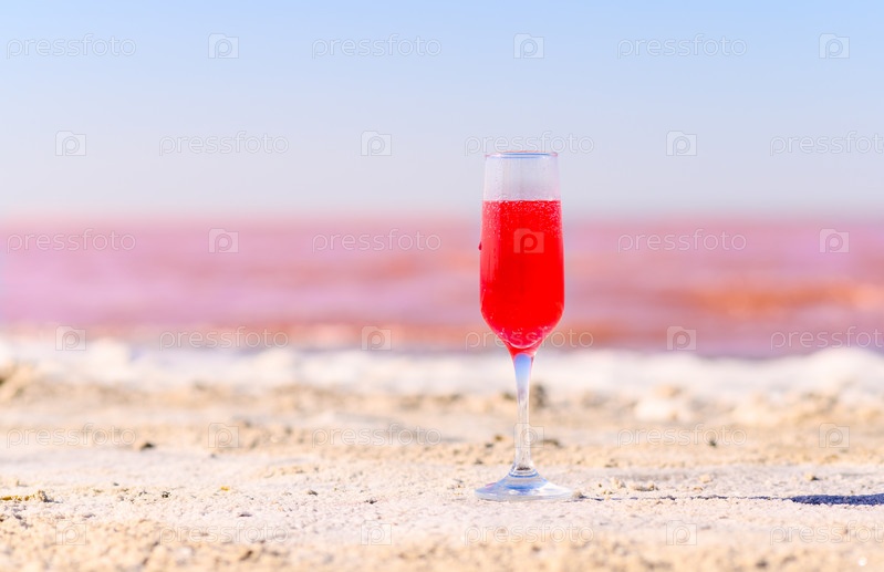 Стакан с розовым напитком на белом берегу розового озера. Сказочная и романтическая атмосфера. Селективный фокус на стекле