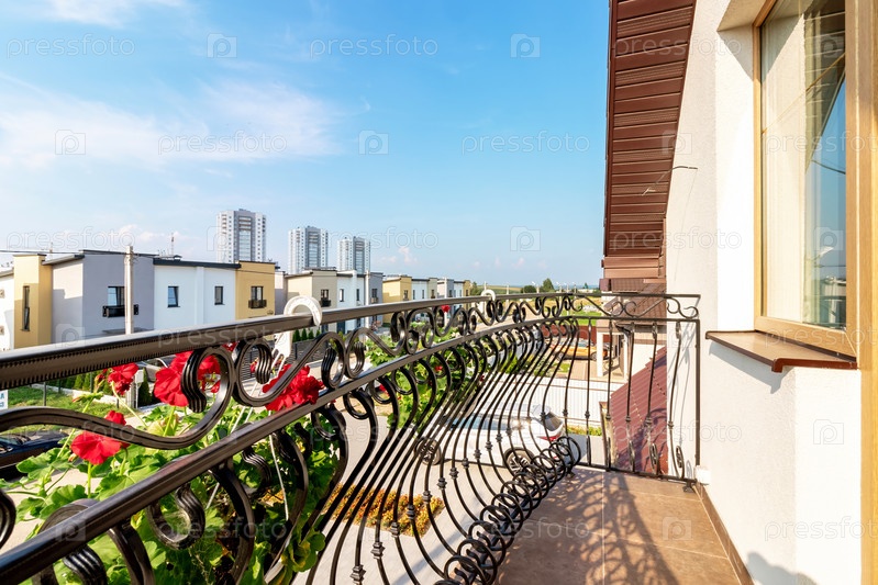 Вид с балкона, украшенного цветами, на современные высотные здания на заднем плане