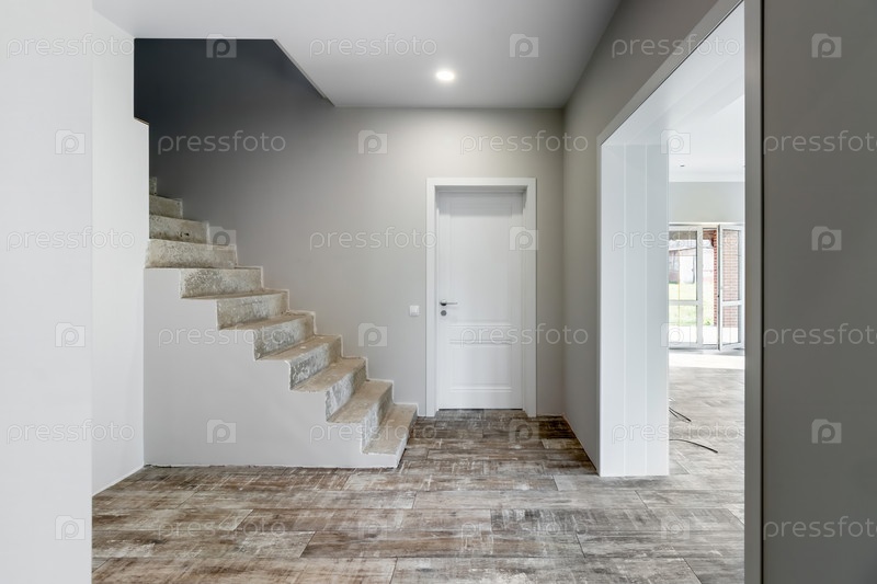 Комната в частном доме сразу после укладки пола, белые неотделанные стены и потолок