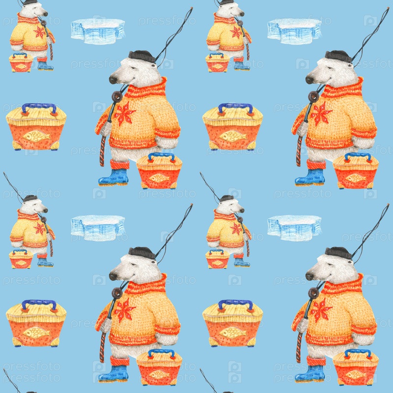 Белый медведь идет на рыбалку. Акварельные бесшовные узоры для текстиля, оберточной бумаги и любого плиточного дизайна. Синий фон, контур обрезки не включен