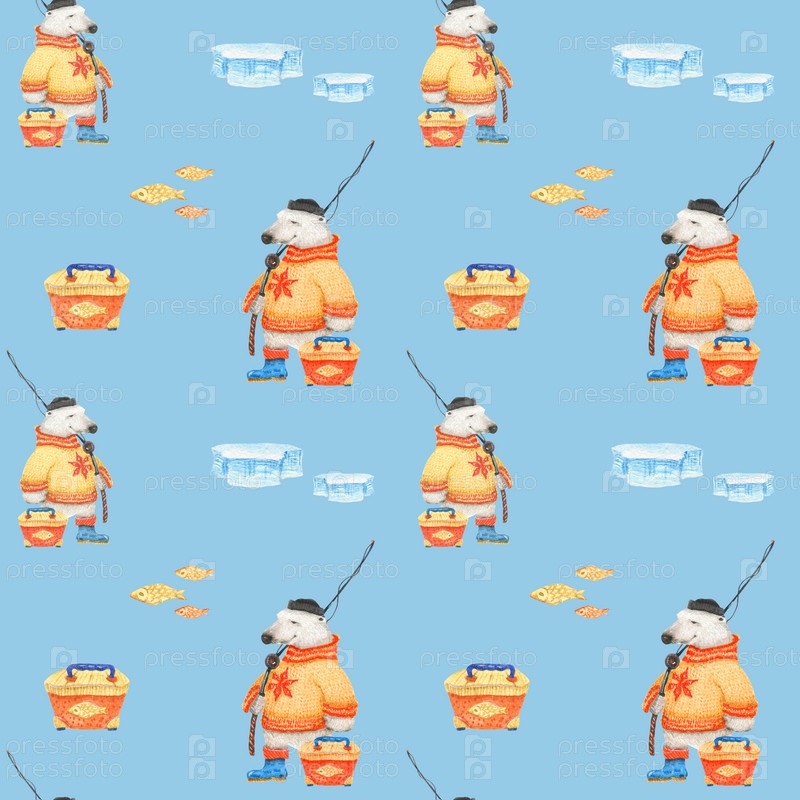 Белый медведь Фишер. Акварельные бесшовные узоры для текстиля, оберточной бумаги и любого плиточного дизайна. Синий фон, контур обрезки не включен