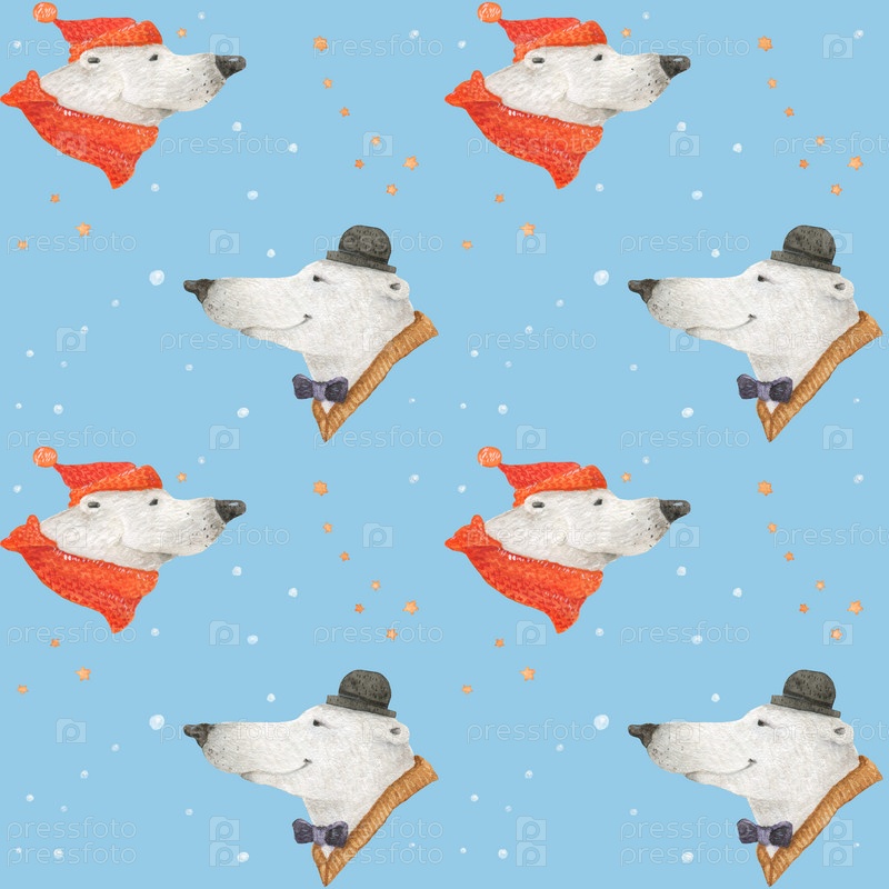 Зимние забавы белого медведя. Портреты арктических медведей. Акварельные бесшовные узоры для текстиля, оберточной бумаги и любого плиточного дизайна. Синий фон, контур обрезки не включен