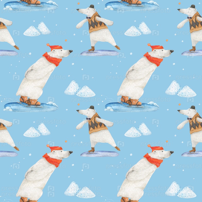 Зимние забавы белого медведя. Арктические медведи катаются на коньках. Акварельные бесшовные узоры для текстиля, оберточной бумаги и любого плиточного дизайна. Синий фон, контур обрезки не включен