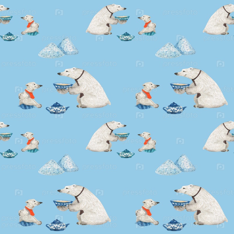 Отец и сын белых медведей пьют чай. Акварельные бесшовные узоры для текстиля, оберточной бумаги и любого плиточного дизайна. Синий фон, контур обрезки не включен