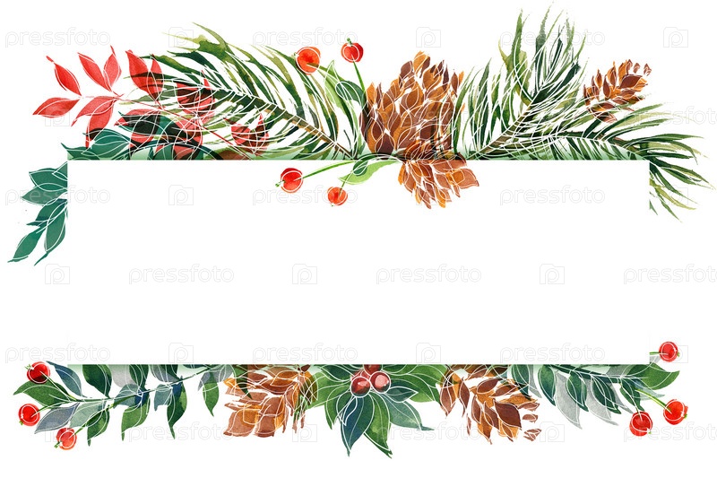 Рождественская акварельная сосна, падуб и зимняя открытка с растениями. Подходящая рамка с местом для текста для рождественских и новогодних поздравлений и приглашений