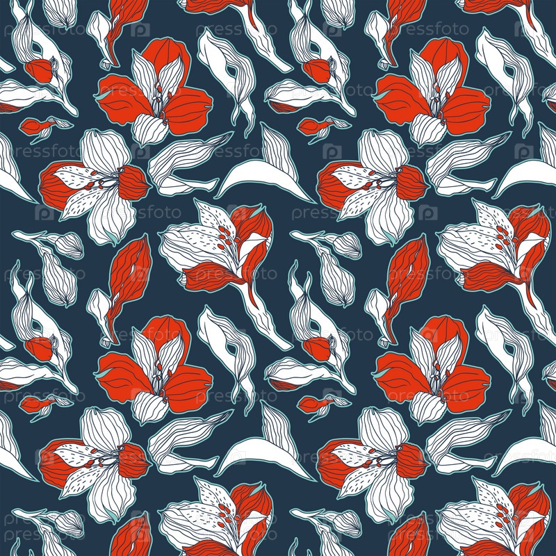 Темно-синий и бесшовный узор с бело-красными бутонами и цветами альстромерии
