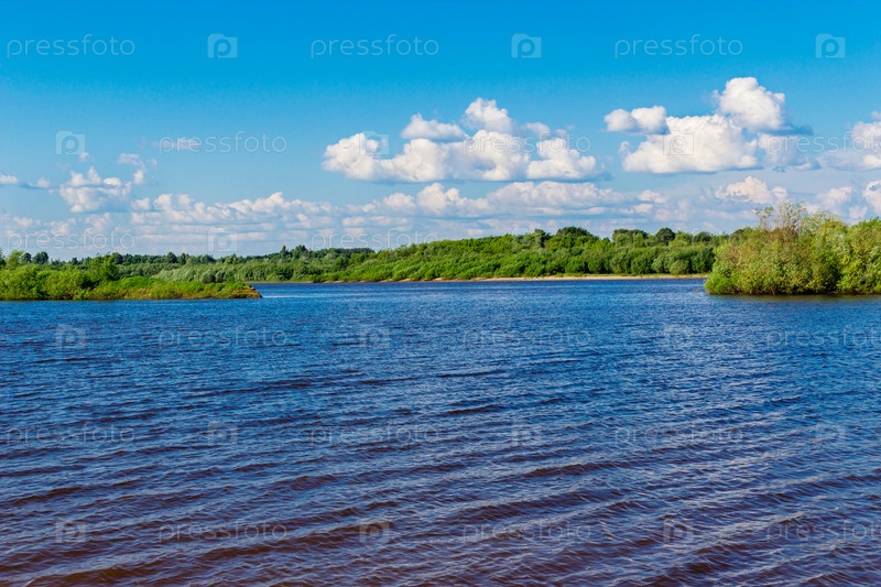 Летний пейзаж с рекой и облаками в небе