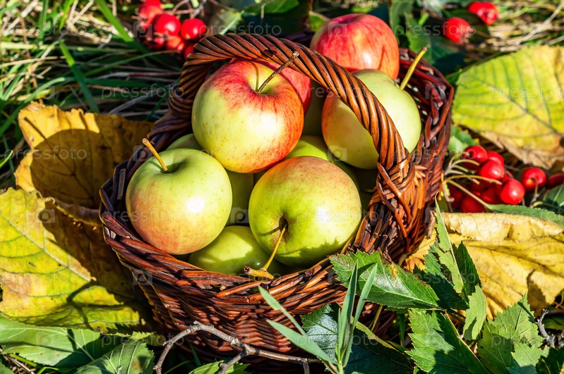 Корзина, полная красных сочных яблок, стоящая на траве в осеннем саду