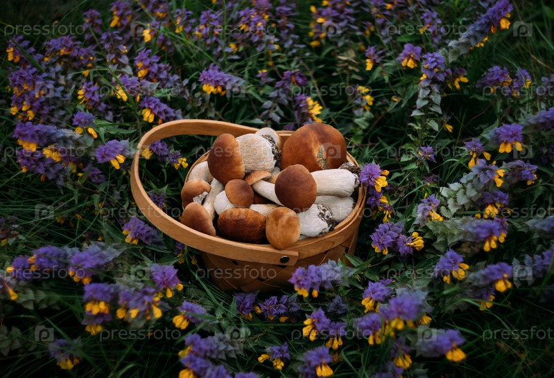 Красивые грибы подосиновики в корзине на цветочном фоне. Съедобные вкусные грибные булочки, белые грибы, белые грибы, белые грибы, подосиновики. Голубые цветы коровьей пшеницы