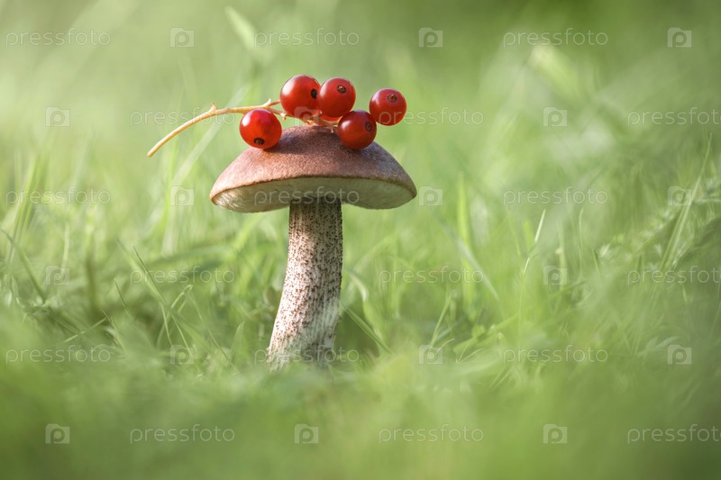 Красивый гриб с красными ягодами на фоне зеленой травы. съедобный вкусный гриб Грубый подберезовик или берёзовый гриб, leccinum scabrum крупным планом