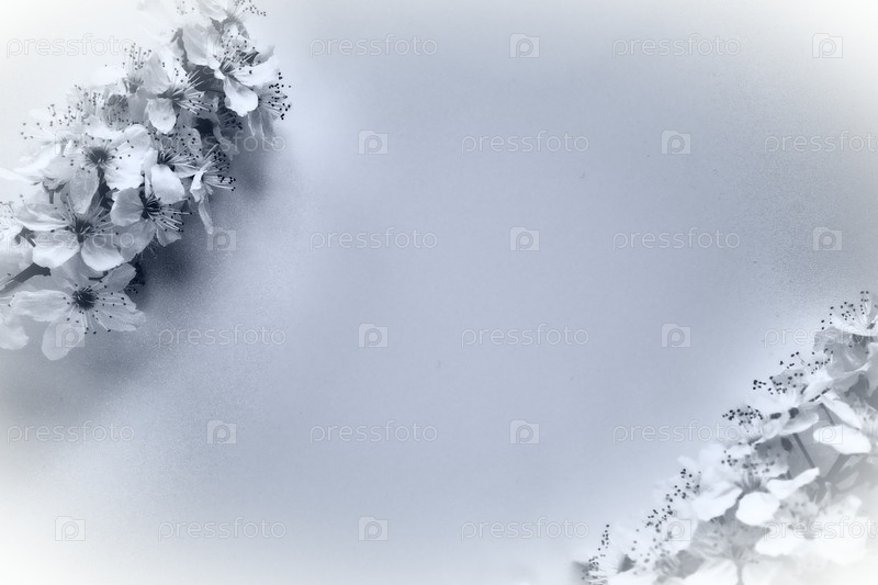 Цветы черемухи, вишни или черешни и пространство для копирования посередине. Весенние цветы и абстрактный фон. Две ветки с множеством цветов. Монохромное черно-белое фото. Открытка для текста