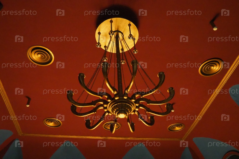 Театральная золотая люстра под потолком театрального зала. Торжественный и насыщенный вариант освещения интерьера. Театральная атмосфера. Интерьер в красном, бордовом и золотом цветах. Энергосбережение и безопасность