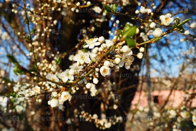 Цветение вишни, черешни и черемухи. Красивые ароматные белые цветы на ветвях в золотой час. Весенние белые цветки собраны в длинные густые поникающие кисти