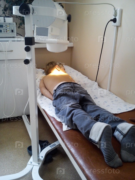 Процедура магнитотерапии при симптомах атопического дерматита. Мальчик. Мягкий желтый свет падает из устройства на спину ребенка