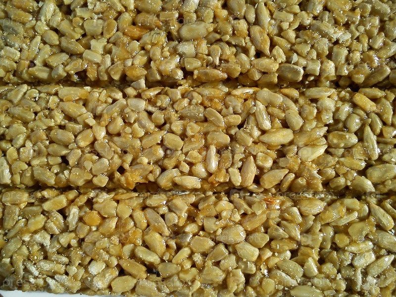 Плитка из семечек в сахарном сиропе. Здоровые мюсли. Горизонтальные полосы. Крупный план. Теплые желтые и охристые цвета. Диетическое питание с витаминами и минералами