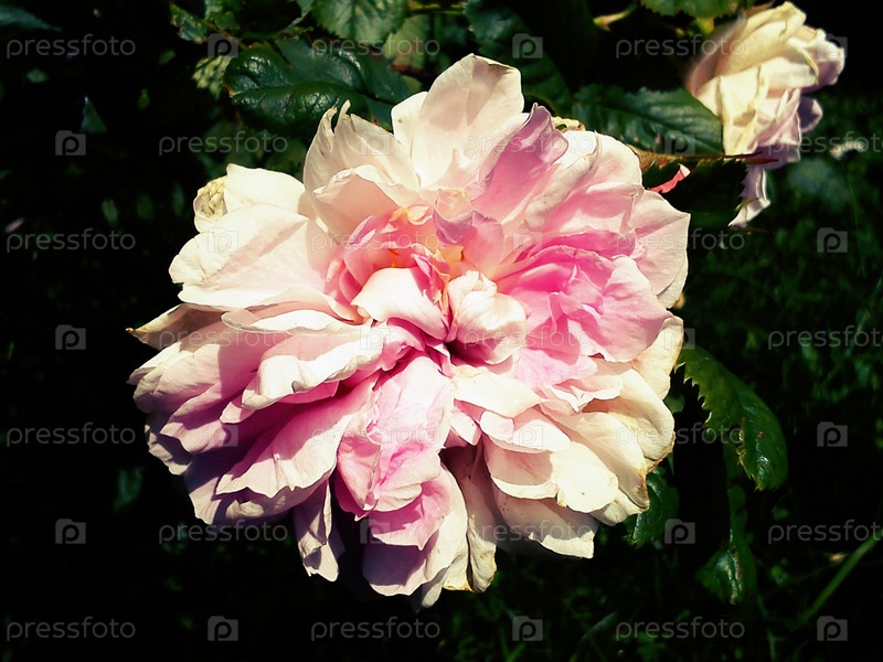 Широко раскрытая розовая роза. Бело — розовые нежные лепестки готовы выпасть из чашелистиков. Зрелое растение. Лето в розарии. Зеленые листья обрамляют бутон