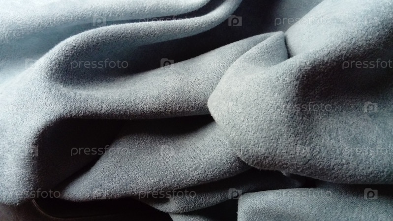 Крупный план бархатистой плотной ткани для штор серо-голубого цвета, плиссированных игрой светотени