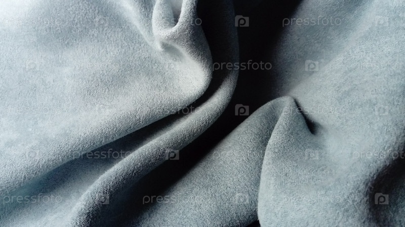 Крупный план бархатистой плотной ткани для штор серо-голубого цвета, плиссированных игрой светотени