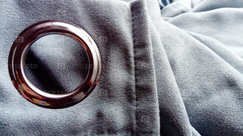 Крупный план металлической петельки на серо-синей занавеске из плотной бархатистой ткани