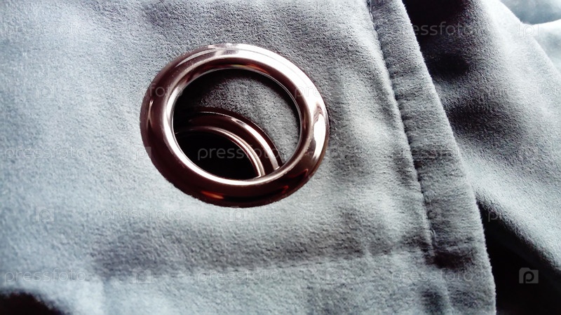 Крупный план металлической петельки на серо-синей занавеске из плотной бархатистой ткани