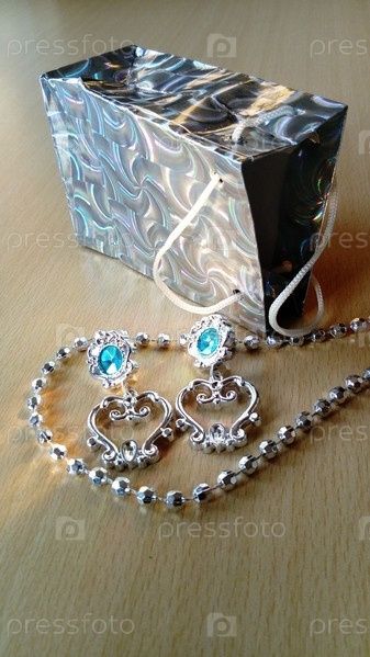 Из подарочного пакетика выпали блестящие серебряные серьги с голубыми камнями. Подарок женщине на праздник