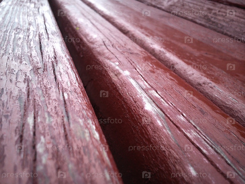 Текстура дерева. Деревянная скамейка, окрашенная масляной краской в бордовый цвет. Трещины на бревне. Продукт из досок. Влага на древесине