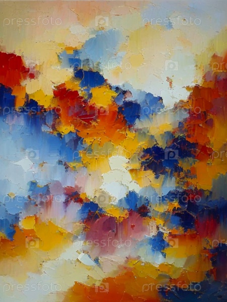 Абстрактные пятна, нарисованные масляной краской. Красные, желтые, синие, белые, оранжевые хаотичные штрихи. Яркие бесформенные кляксы