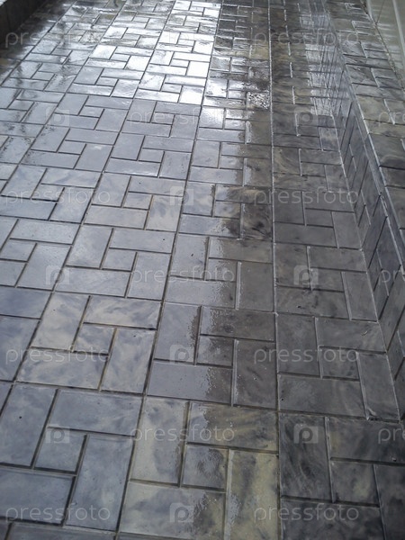 Мокрая серая плитка на тротуаре после дождя с тенью от здания