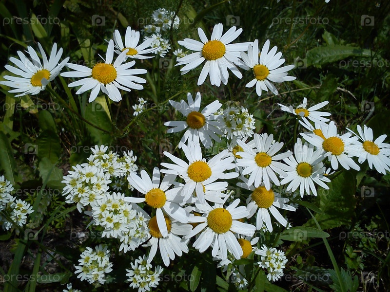 Поле цветущих ромашек. Луговые цветы. Лепестки белые с желтой сердцевиной. Многие лекарственные растения летом на клумбе. Открытка или картинка. Невинный букет
