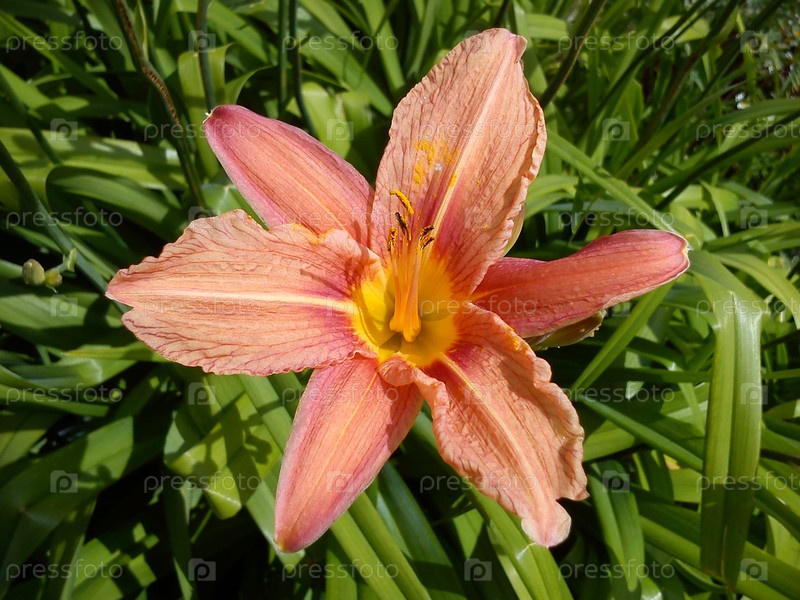 Красивый большой цветок лилии. Ярко-оранжевый цвет лепестков и желтой сердцевины. Хорошо видны пестики и тычинки. Тонкие длинные зеленые листья обрамляют цветы. Летнее время в саду