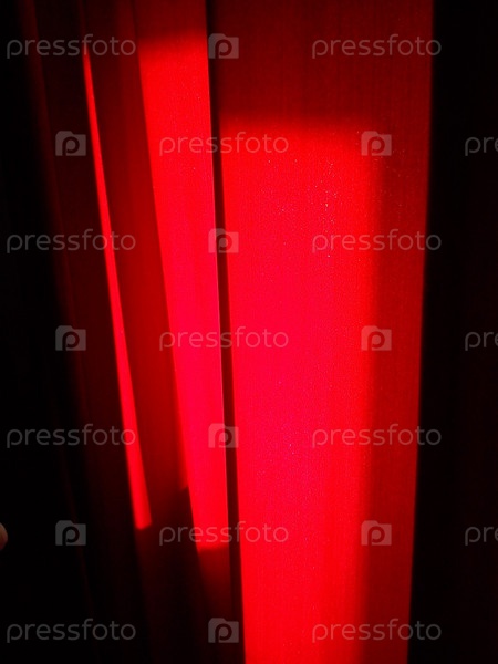 Крупным планом темно-красные шторы в комнате. Ткань - плотный бархат, с обратной стороны которого проникает дневной свет, на ткани видно освещение