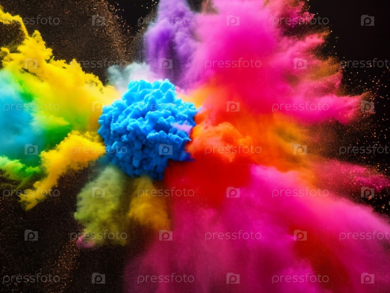Взрыв цветного порошка на черном фоне. Абстрактный цветной фон. Желтый, розовый, фиолетовый, красный, оранжевый, зеленый, синий порошок мгновенно рассыпается в облака пыли. Химические эксперименты