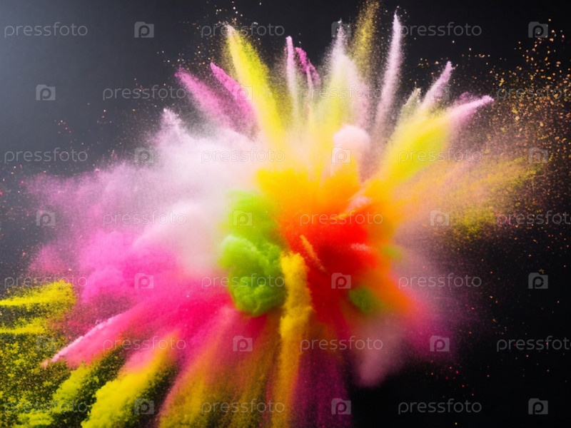 Взрыв цветного порошка на черном фоне. Абстрактный цветной фон. Желтый, розовый, фиолетовый, красный, оранжевый, зеленый порошок моментально рассыпается в облака пыли. Химические эксперименты