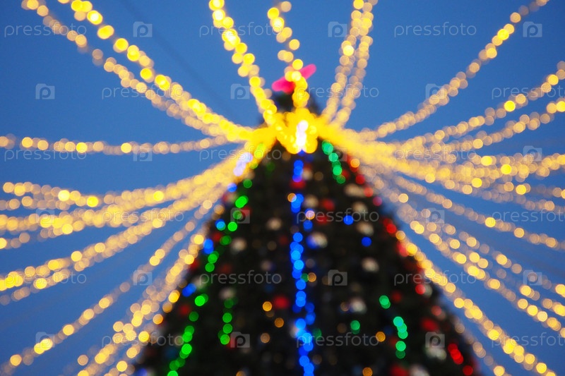 Разноцветные стеклянные блестящие шары на новогодней городской елке. Над елкой висят светящиеся гирлянды. Уличное зимнее украшение. Праздничное оформление городской площади. Красный, синий и желтый шар