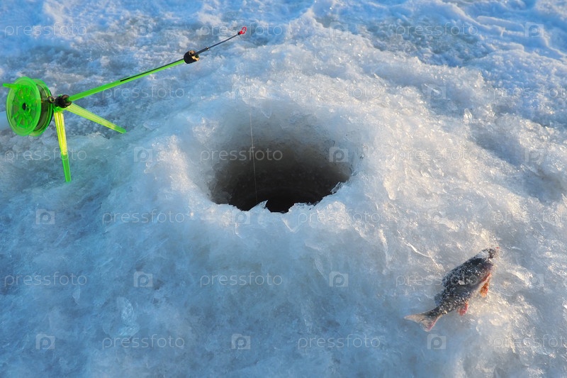Замороженный маленький окун на снегу и льду. Улов, пойманный во время зимней рыбалки. Речной окун или обычный окун Perca fluviatilis, лучезарная рыба из рода пресноводных окунов. Дочь в яме
