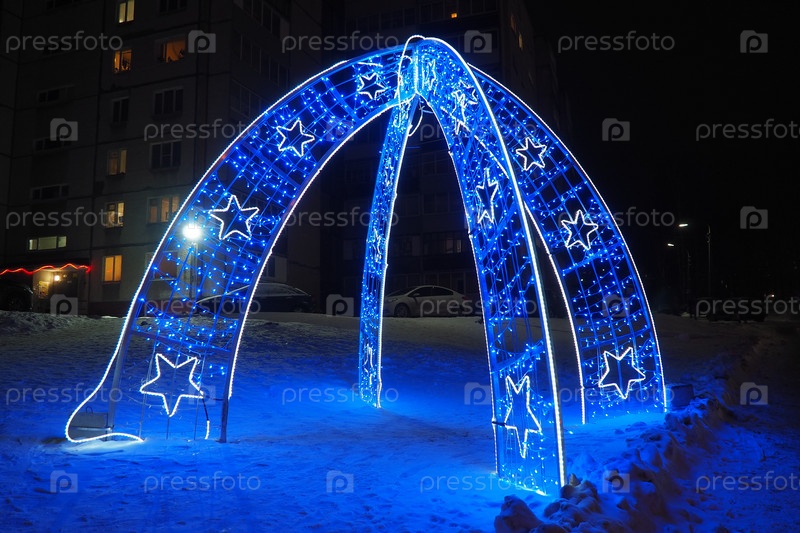 Арка с голубыми уличными гирляндами. Праздничный фон. Сине-белые лампочки как украшение новогодней и рождественской ночи. Дизайн уличного оформления. Абстрактные световые пятна. Форма звезды