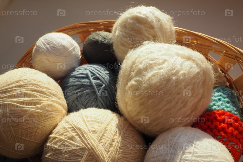 Белые, бежевые и синие шерстяные и акриловые нити скручиваются в клубок или моток. Несколько мотков светлой пряжи в корзинке. Вязание как хобби. Клубок ниток