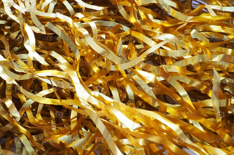 Мишура-дождик золотистого цвета. Новогодние и рождественские украшения для елки, интерьера или праздничной комнаты. Плетение нитками из золотой фольги. Праздничный красивый блестящий фон. Мишура крупным планом
