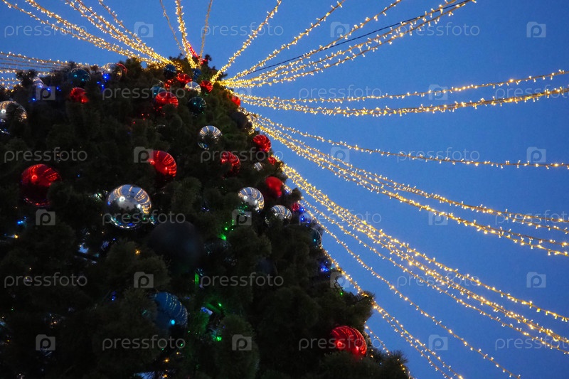 Разноцветные стеклянные блестящие шары на новогодней городской елке. Над елкой висят светящиеся гирлянды. Уличное зимнее украшение. Праздничное оформление городской площади. Красный, синий и желтый шар