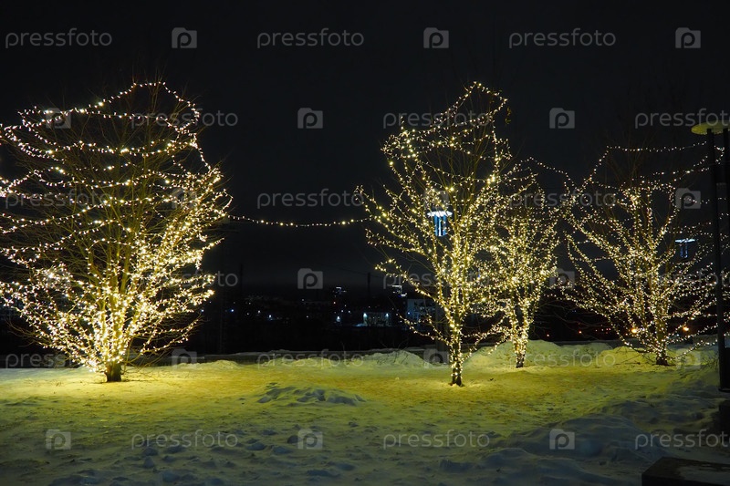 Новогодняя или рождественская городская ночная улица. Снежные сугробы. Дизайн освещения деревьев. Наматывание гирлянд на ствол и ветки. Светодиодные новогодние украшения. Гирлянды - паук и зажим-светильник. Электрическое освещение