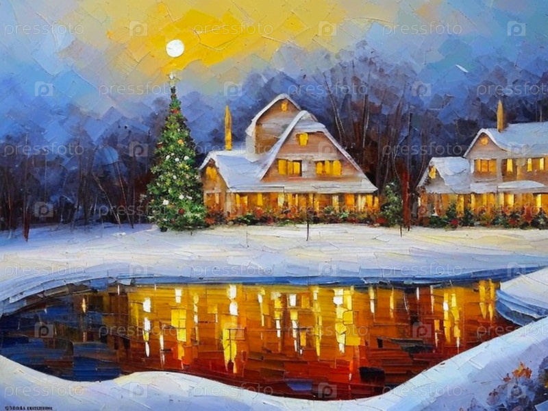 Милые уютные домики в лесу в новогоднюю ночь. Рождественская елка с украшениями. Замерзший пруд. Отражение гирлянд и окон в воде. Луна в небе. стиль масляной краски