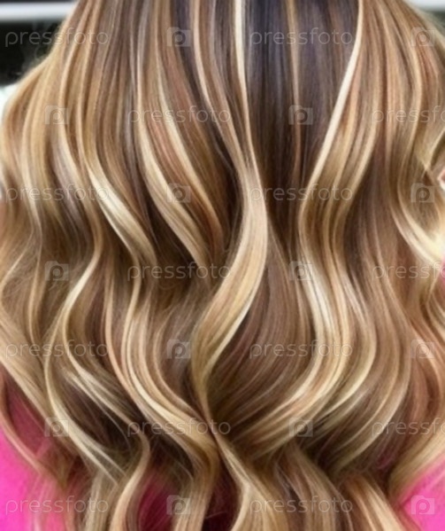 Крупный план волнистых светлых волос молодой блондинки. Результат окрашивания, мелирования, химической завивки. Красота и мода. Мелирование волос. Крупные кудри шатенки, вид сзади. Длинные волосы